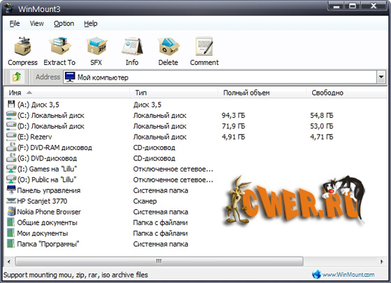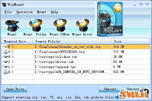 WinMount предназначен для создания виртуальных дисков из любого архива или файл-образа (очень удобно, так как можно работать с файлами в архиве без необходимости непосредственного извлечения). Программа поддерживает работу с практически всеми форматами файлов-образов: ISO, CUE/BIN, CCD,BWT, MDS, CDI, NRG, PDI B5T и ISZ, а также с архивами ZIP и RAR.