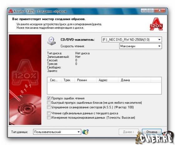 Alcohol 120% - эмулятор CD/DVD-дисков. Программа создает на жестком диске ПК пользователя образ диска с данными, аудио или видео информацией, а затем предоставляет доступ к этим данным другим программам так, словно искомый диск находится в приводе. Alcohol 120% поддерживает работу со многими форматами CD/DVD, имеет возможность работы с 31 образом одновременно, обеспечивает несоизмеримо большую (по сравнению с CD) скорость передачи данных между приложением и образом диска. Alcohol 120% может работать с большинством известных файлов-образов, эмулирует работу 200х скоростного CD-ROM, есть поиск образов, еще одна положительная черта - программа может копировать защищенные диски, обходить защиту SafeDisc, StarForce (частично), Securom и LaserLock.