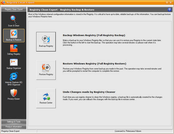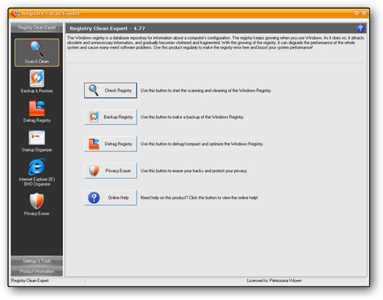 Registry Clean Expert - программа для сканирования реестра на предмет неправильной или устаревшей информации. Благодаря изменению таких данных в реестре система начинает работать быстрее и без ошибок. Программа имеет опцию резервного копирования и восстановления реестра на случай, если система даст сбой. Кроме этого, используя Registry Clean Expert, вы можете управлять приложениями, которые запускаются вместе с Windows и Internet Explorer. Также утилита включает в себя модуль поиска "шпионских" модулей. Имеет интуитивно-понятный интерфейс и работает на платформах Windows Vista, XP, 2003, 2000, ME и Windows 98.