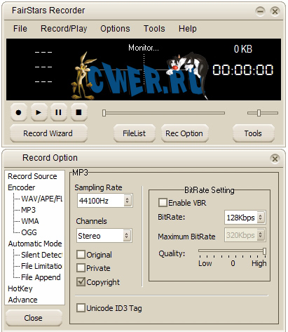 FairStars MP3 Recorder – это программа записи аудио в режиме реального времени, предоставляет профессиональные функции записи с полной поддержкой MP3, OGG, APE и WAV форматов. Данная программа позволяет вам записывать звук прямо с вашей звуковой карты, включая запись с микрофона или с линейного входа, запись производится на высоком качестве. Данная программа может использоваться для захвата звука, включая музыку, диалоги с фильмов, игровые звуки, потоковое аудио и все что угодно. Захваченный звук может быт сохранен напрямую в MP3, OGG, APE или WAV формат, без нужды во временных файлах. В дополнение, данная программа включает ID3 тег редактор. К дополнительным функциям относится пропуск тишины (программа обнаружения тишины), ограничения по размеру файла и многое другое.