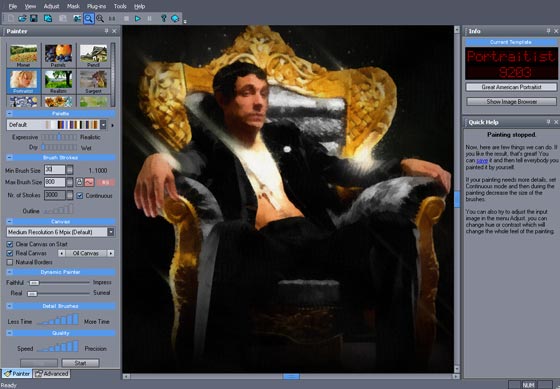 Dynamic Auto-Painter уникальная программа, которая позволяет превратить ваши фотографии в картины, используя имитацию техники рисования самых знаменитых художников планеты.В отличие от других подобных утилит, Dynamic Auto-Painter не изменяет саму фотографию, он просто использует изображение в качестве оригинала, с которого автоматически рисует новое изображение, используя соответствующие кисти и стили. При этом вы можете наблюдать за работой программы, как за работой настоящего художника.