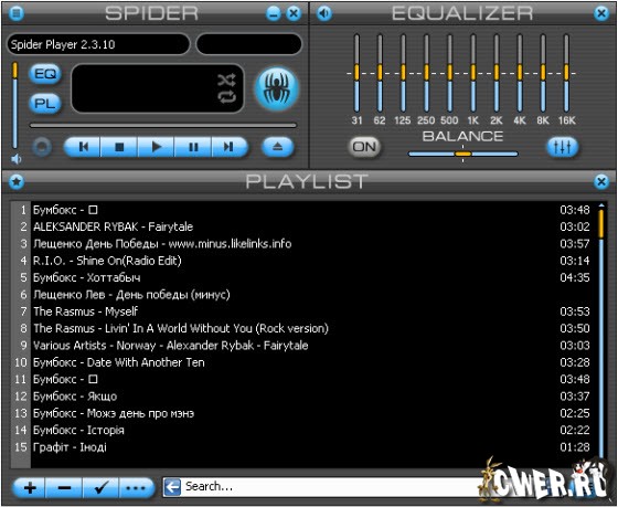 Spider Player - многофункциональный аудио плеер для Windows использующий для воспроизведения звука известную библиотеку Bass audio library и набор ее расширений. Плеер полностью поддерживает Юникод, имеет мощные редакторы тегов для различных типов файлов, возможность конвертирования файлов в один из следующих форматов: MP3, WMA, OGG, WAV (параметры конвертирования настраиваются). Также имеется возможность извлекать треки с CD в один из вышеуказанных форматов. Плеер содержит простой и удобный редактор текстов песен, поддерживаются CD-text, интернет-радио, скины, смена языка интерфейса и многое другое.