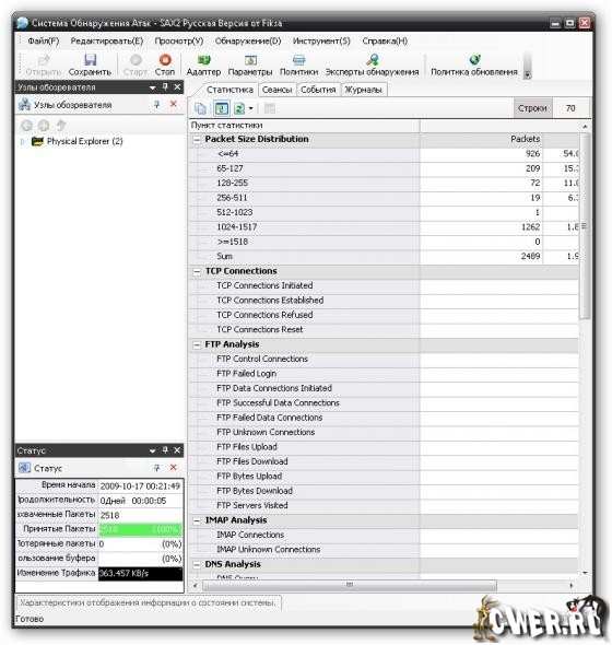 Sax2 - это профессиональная программа для обнаружения сетевых атак и их предотвращения (NIDS), которая перехватывает пакеты в реальном времени, выполняет функции сетевого монитора, анализатора протоколов и автоматически обнаруживает проблемы. Sax2 с легкостью изолирует и решит любые проблемы сети, обнаружит узкое место сети и пропускную способность канала, найдет слабые места сети, обнаружит следы атаки на сеть, а затем перехватит и остановит опасные соединения.
