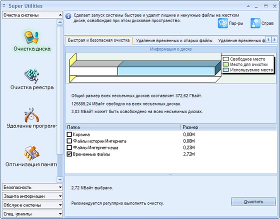 Super Utilities - сборник полезных утилит, при помощи которых вы сможете наладить, очистить и ускорить работу своей операционной системы. Пакет утилит служит для ежедневного использования и позволяет производить поиск и удаление ненужных файлов, очистку и оптимизацию системного реестра, имеет менеджер автозагрузки, а также позволяет производить защиту папок, резервное копирование, анализ папок. Также программа имеет средство для полного удаления ставших ненужными программ, менеджер процессов, менеджер конфиденциальности Internet Explorer и многое другое. В программе имеется простой пользовательсий интерфейс с мультиязычной поддержкой, а также имеется поддержка смены скина интерфейса. Работает на платформах Windows 98/Me/2000/XP/2003/Vista.