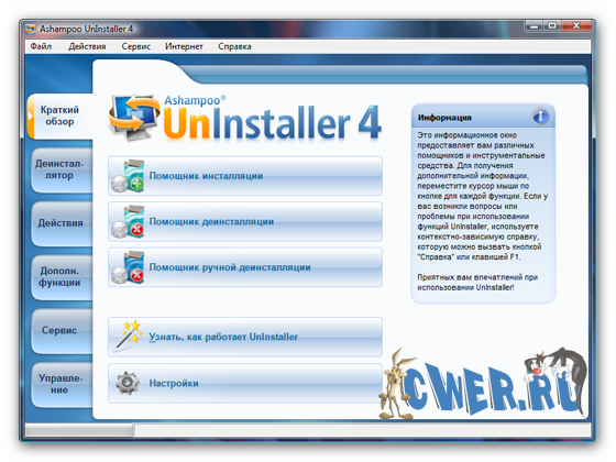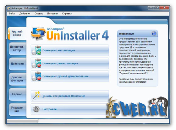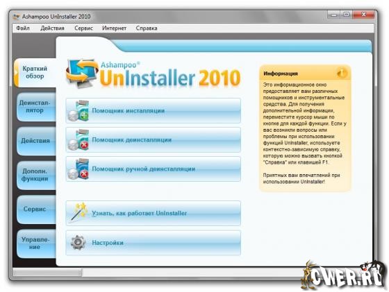 Ashampoo UnInstaller - деинсталлятор программ с прекрасно организованным интерфейсом и алгоритмом работы. Эта утилита отслеживает и регистрирует изменения, которые вносят инсталляционные программы, что позволяет при необходимости корректно удалить ненужную программу. Положительным качеством является то, что данная программа удаляет не только те приложения, что были отслежены ей, но и путем анализа деинсталлирует программы, мониторинг которых не производился. Кроме своей основной функции, программа способна удалять дубликаты и временные файлы, управлять установленными в систему шрифтами. Имеет стильный пользовательский интерфейс с мультиязычной поддержкой, включая поддержку русского языка.