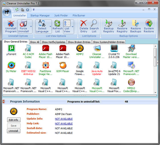 Cleanse Uninstaller — системная утилита, разработанная для деинсталляции приложений и абсолютного удаления их файлов из реестра. Программа произведет сканирование системы на все установленные приложения, включая обновления Windows. Они отобразятся в окне утилиты в виде пиктограмм или подробного списка. Иногда случается так, что установленная программа никаким образом сама не хочет деинсталлироваться, при этом сообщая пользователю о каких-то ошибках. Удаление таких приложений вручную достаточно трудоемко, но только не с данной программой. Сам процесс удаления проходит намного быстрее, чем со стандартным аплетом или аналогичными утилитами.