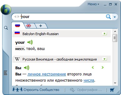 Babylon — словарь, позволяющий переводить слова с одного языка на другой. Работать со словарем очень просто — после нажатия кнопкой мыши на интересующее слово появляется окно с его переводом. Кроме перевода слов, программа включает в себя английские тематические и толковые словари, а также имеет функции конвертации валют на текущую дату и перевода мер из одной системы в другую.
