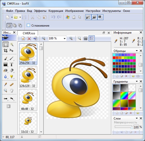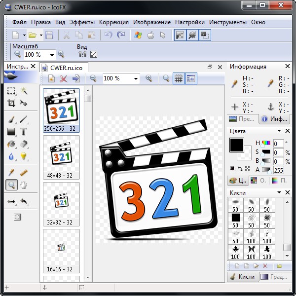 IcoFX - кроссплатформенная утилита для создания и редактирования иконок и курсоров с поддержкой прозрачности. Поддерживает статические и анимированные курсоры. Также с ее помощью можно создать логотип для вашего сайта или блога. Поддерживаемые форматы изображений: BMP, PNG, JPG, JPG2000, TIF и GIF. С помощью этой программы вы сможете извлекать иконки из разных файлов.