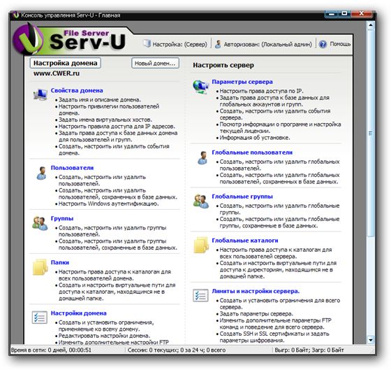 Serv-U- гибко настраиваемый файловый сервер для операционных систем Windows. Как один из самых популярных в отрасли, Serv-U имеет богатую историю как надежный, быстрый и многофункциональный сервер, что является жизненно важным для администраторов. Функции безопасности обеспечиваются паролями и установкой прав на запись/чтение/изменение для каталогов и файлов для каждого пользователя, а также контролем доступа по IP-адресам. К другим особенностям относится поддержка одновременной работы нескольких пользователей, установка коэффициентов для upload/download, установка дисковых квот, поддержка возобновления приема-передачи, поддержка SSL для обеспечения безопасных соединений, мониторинг работы пользователей в реальном времени и ведения логов.