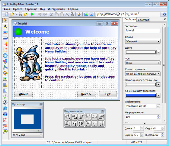 AutoPlay Menu Builder - одна из лучших программ для создания автоматически проигрываемого меню для запуска CD и DVD диска. При этом от пользователя не требуется никаких знаний в программировании. Все что от вас потребуется - это сделать несколько нажатий и движений мышью для создания потрясающего меню автозапуска диска, которое будет появляться сразу же после вставки диска в дисковод компьютера. Из меню пользователь сможет запускать различные приложения, открывать файлы и документы, проигрывать видеоролики и многое, многое другое. AutoPlay Menu Builder является простым в использовании и понимании приложением, которое всегда поможет вам создать оригинальное меню автозапуска для ваших дисков.