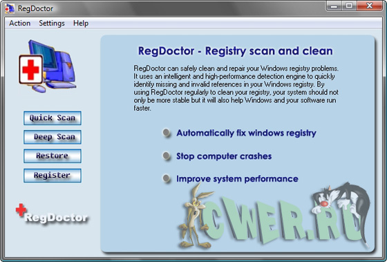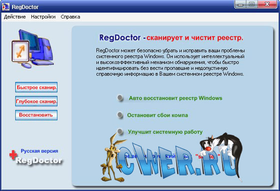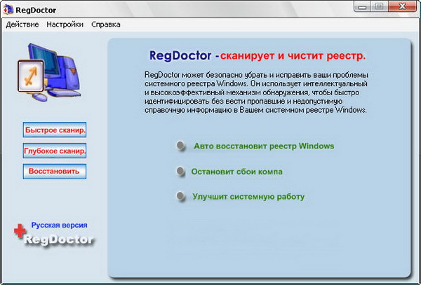 RegDoctor - программа предназначена для исправления ошибок в реестре. Программа дает возможность устранить такие часто возникающие проблемы, как сообщения об ошибках, вылет операционной системы и многие другие. Программа сканирует системный реестр и выводит проблемные значения, помечая из разными цветами, в зависимости от степени риска. Например, если программа считает, что ошибка критическая, она выделяется красным. Программа может и исправлять все обнаруженные ошибки. Не забыли разработчики и о функции восстановления, которая поможет вернуть систему в исходное состояние, если действия, выполненные при помощи программы, приведут к нежелательным последствиям.
