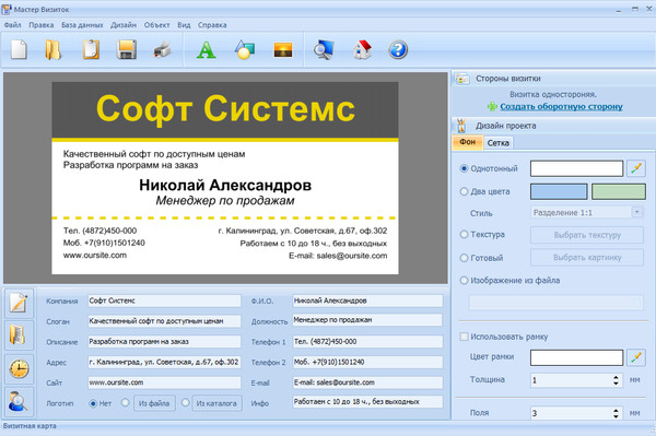 BusinessCards MX - программа для создания и проектирования визиток. При помощи этой программы Вы легко и быстро спроектируете и распечатаете профессиональные визитки. Интерфейс программы спроектирован так, чтобы даже у начинающего пользователя не было проблем с обслуживанием программы. Процесс проектирования заключается во вставке готовых доступных в программе элементов таких, как текст, фигуры, изображения и фон, а также произвольном их перемещении на разрабатываемом проекте. Программа использует шаблоны визиток, которые можно подготовить самому или использовать готовые образцы визиток, доступные в программе. В программе доступны около 400 образцовых шаблонов визиток.
