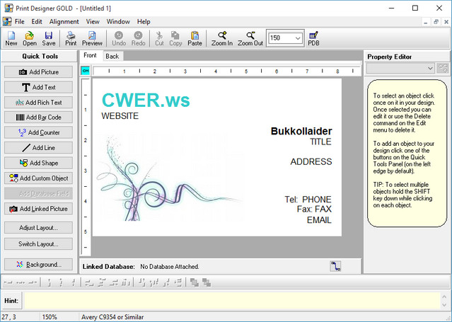 Print Designer GOLD - программа для создания визиток. Быстро. Удобно. Качественно. Множество готовых шаблонов (если лень делать самому). Возможность подбора фона, оформления, размера и типа шрифта и т.д. Имеется режим автозаполнения. Сохраняет и поддерживает данные нескольких пользователей. При распечатке страниц дает возможность обозначить линии для последующей разрезки. Есть возможность сохранения созданной визитки в отдельный графический файл. Наверно многие помнят аналогичную программу под названием Business Card Designer Plus. Print Designer GOLD отличается от последней наличием нескольких дополнительных мастеров, поддерживающих Базу Данных и значительно увеличивающих возможности программы при печати и создании новых визиток.