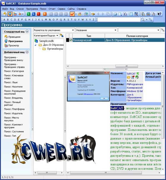 SoftCAT - мощная программа для создания софт-каталога из ПО, находящегося на компьютере. SoftCAT позволяет организовать удобную базу данных с детальной информацией о каждой, отдельно взятой программе. Пользователь может заполнить более 30 полей, в которых будут содержаться данные о приложениях (название программы, номер версии, язык интерфейса, размер дистрибутива, адрес домашней страницы, имя разработчика, статус, место хранения дистрибутива и т.д.). Причём, такой софт-каталог может охватывать программы, находящиеся на сетевом или жёстком диске, на CD, DVD и других носителях. Позволяет создать резервную копию и защитить софт-каталог паролем от просмотра и изменения. SoftCAT является интуитивно понятным и простым в использовании приложением, используя которое вы в скором времени заметите, что это все что Вам необходимо, чтобы следить за вашим программным обеспечением.