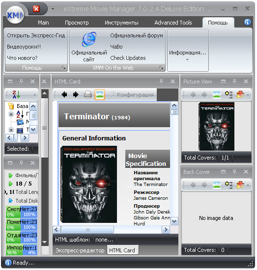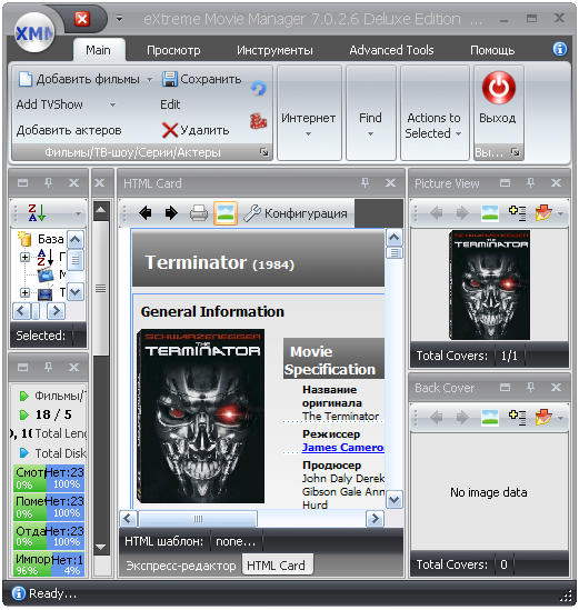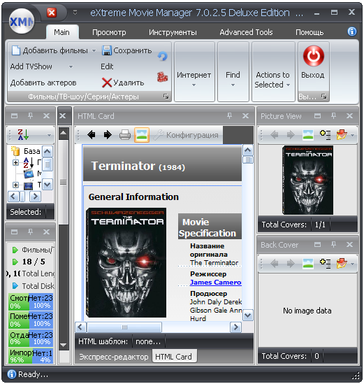 eXtreme Movie Manager - лучшая программа для ведения домашней фильмотеки. Для каждого фильма предоставлено более 70 (!) полей описания, разделенных по подгруппам. Возможность импорта данных со специализированных сайтов, есть возможность создания собственного импорт-скрипта.