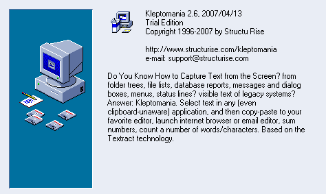 Capture Text - позволяет вам выделить текст в любом месте экрана, включая области, которые вы не можете выделить с помощью мыши, такие как: столбцы данных в программе редактирования текстов или сообщение об ошибке любой программы. Capture Text использует технологию оптического распознавания символов (OCR), позволяющую захватывать текст в любом месте экрана, включая выборки по базам данных, формы и отчеты, сообщения об ошибках, окна диалогов, строки состояния, деревья папок и списки файлов.