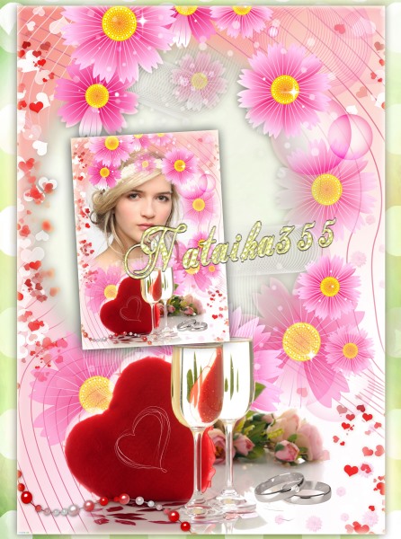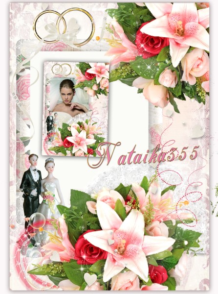 Свадебная рамка с нежными цветами, кольцами и другой атрибутикой торжества.