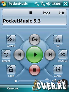 PocketMusic Player - продвинутый аудио-плеер с 10-полосным эквалайзером проигрывает музыку в форматах MP3, Ogg Vorbis и WMA. Есть вариант интерфейса с крупными кнопками, ориентированный на работу в горизонтальном положении экрана.