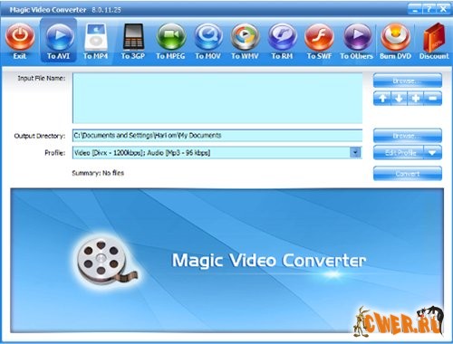 Magic Video Converter - многофункциональный конвертер со встроенным редактором и рекордером, который поможет вам преобразовать нужный файл в определенный формат: AVI, MPEG, MPEG 1, MPEG 2, MPEG 4, VCD, DVD, SVCD, RMVB, RM, WMV и другие видео форматы.