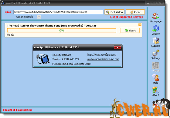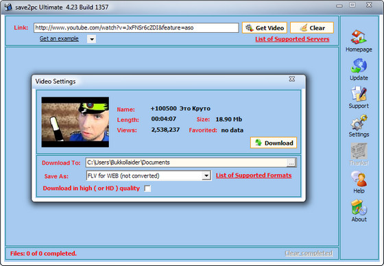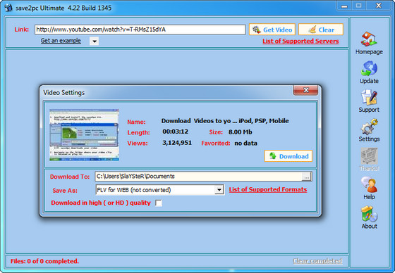 save2pc - это крайне простая в использовании утилита, которая позволяет сохранять видео с известного файлового хранилища YouTube и Google Video. Просто вставьте ссылку на нужный файл в окошке программы, укажите папку для сохранения видео, а все остальное save2pc сделает сама, вы же в результате получите интересующий вас .avi, .mpeg, .flvG файл или файл в мобильном формате mov, mp4, 3gp, mp3, wav. В программе возможно просматривать видео без дополнительных кодеков и скачивать нескольких файлов одновременно.