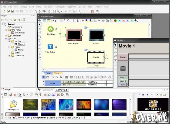 Профессиональная программа для создания DVD-Video. DVD-lab Pro имеет большую библиотеку заготовок для создания меню, позволяя пользователю изменять каждую из них по собственному усмотрению, в частности, добавляя различные эффекты. Скажем, можно заставить кнопки гореть или превратить в металл. При создании меню можно использовать функцию списков воспроизведения, создавать кнопки с задержкой, добавлять специальные объекты навигации, использовать анимационные эффекты.