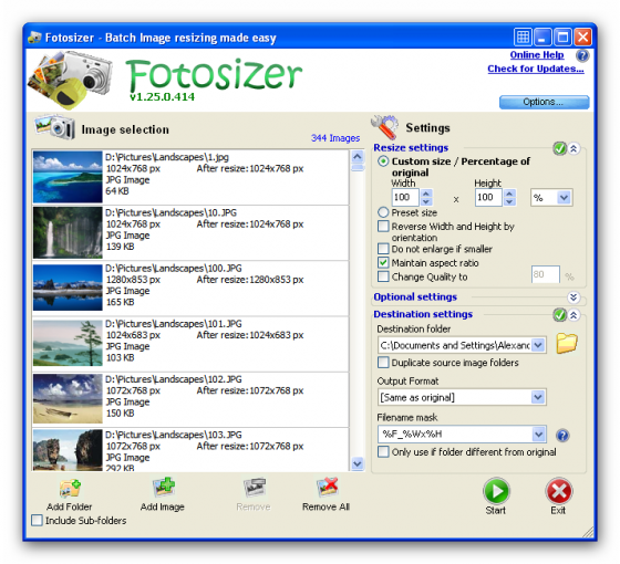 Программа Fotosizer предназначена для пакетной обработки графических изображений, а именно изменения их размеров. Программа позволяет за раз обрабатывать сразу большое количество картинок (целые директории), поддерживаются .JPG, .JPEG, .PNG, .BMP и .GIF форматы.