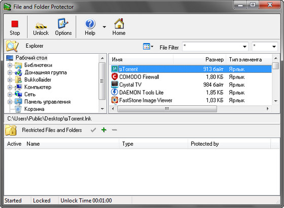 File & Folder Protector защищает паролем ваши файлы и папки. File & Folder Protector позволяет установить защиту на просмотр, открытие, изменение, удаление файлов и папок. Для защиты данных File & Folder Protector обладает целым набором полезных функций, но в то же время очень прост в использовании, что делает ее привлекательной для пользователя любого уровня. При помощи File & Folder Protector можно защитить паролем определенные файлы и папки. При открытии любого защищенного файла или папки, появляется диалоговое окно с запросом пароля, и никто не сможет получить доступ к данным, пока не будет введен правильный пароль.