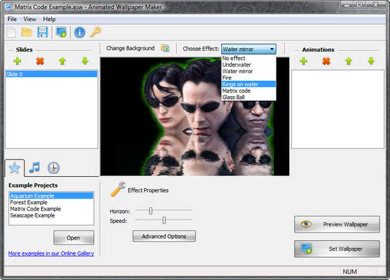 Animated Wallpaper Maker - превратит статичные изображения в анимированные картинки и установит их в качестве обоев рабочего стола. Вы сможете анимировать абсолютно любое изображение. Вам не понадобятся дорогие, сложные программы! Вы сможете создать анимированные обои всего за пару минут. Загрузите изображение, настройте параметры анимации и поместите результат на рабочий стол. В программу входит редактор, позволяющий добавлять анимацию к стандартным обоям Windows (поддерживает все популярные графические форматы) и встроенный плеер, замещающий статичный фон анимированными обоями. Анимированные обои используют минимум системных ресурсов и по желанию могут быть включены или отключены. Вдохните новую жизнь в свой рабочий стол!