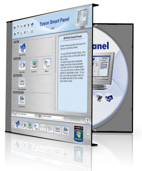 EPSON Smart Panel - это набор утилит для выполнения всевозможных задач сканирования. Со сканером работает через EPSON Scan (хотя не всегда показывает его интерфейс).