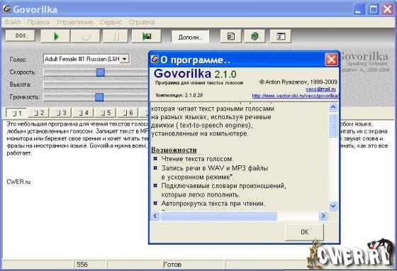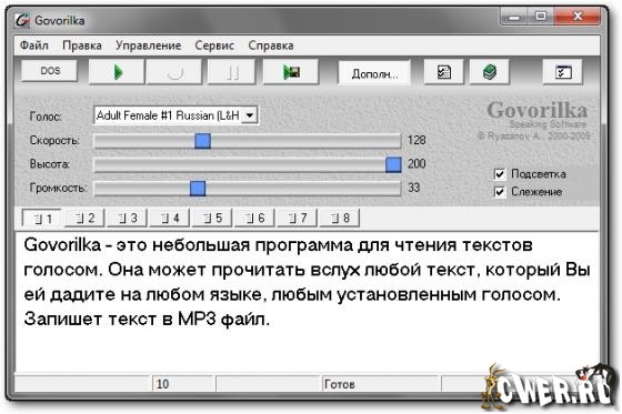 Это небольшая программа для чтения текстов голосом. Она может прочитать вслух любой текст, который Вы ей дадите на любом языке, любым установленным голосом. Запишет текст в MP3 файл. Программа нужна тем, кто больше любит слушать тексты, чем читать их с экрана монитора или бережет свое зрение и хочет читать тексты электронных книг сидя подальше от монитора, кто хочет узнать как звучат слова и фразы на иностранном языке. Govorilka нужна всем, кто хочет научить свой компьютер говорить и кому просто любопытно узнать, как это все работает.