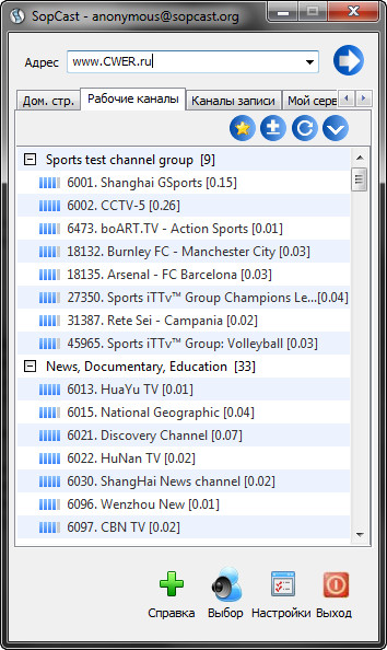 SopCast - программа для просмотра видеотрансляций через интернет - кинофильмы, прямые спортивные состязания, музыка, познавательные, развлекательные каналы и многое другое. Особенностью программы является то, что она работает через P2P сеть, позволяя при этом зарегистрированным пользователям транслировать свои собственные, так сказать, эксклюзивные каналы.
