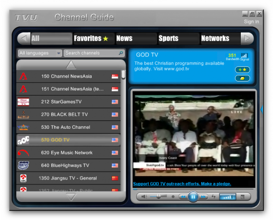 TVUPlayer - программа для просмотра бесплатных Интернет-телеканалов сети TVU. TVUPlayer имеет простой и удобный интерфейс, позволяющий легко управлять просмотром большого числа качественных телеканалов. Для трансляции видео сеть TVU использует пиринговые технологии, что обеспечивает более надежную передачу данных по всему миру.
