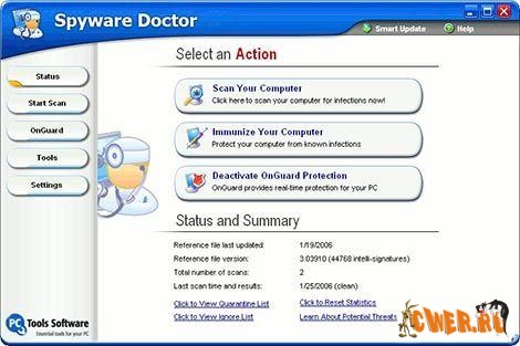 Spyware Doctor - программа для нахождения и удаления шпионских модулей. Spyware Doctor защищает от программ-шпионов (spy), рекламного ПО, троянов, клавиатурных шпионов, кражи личных данных. Кроме того, Spyware Doctor обезопасит пользователей от фишинга, всплывающих окон и ненадежных сайтов. В программе Spyware Doctor предусмотрена отлаженная функция обновления, за счет которой постоянно совершенствуются ее возможности борьбы с программами-шпионами.