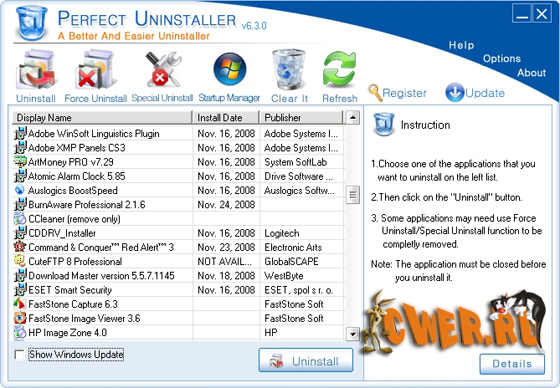 Perfect Uninstaller - отличная программа для полного удаления нежелательных программ, которые нельзя удалить с помощью стандартного диалога удаления и установки программ Windows. С этой программой вы сможете удалять ненужные приложения в вашей системе быстрее и легче. Стандартный диалог установки и удаления программ часто не может удалить определенные приложения или сломанные ключи реестра, в отличие от данной утилиты, программа не только позволит вам удалить приложения, но и очистит ваш ПК от поврежденных записей в системном реестре, улучшая производительность и скорость вашей системы. Кроме того, с помощью этого приложения вы сможете узнать детальную информацию о том, какие файлы и записи реестра затронула установка той или иной программы. Интерфейс программы прост и легок в использовании.