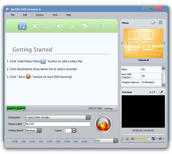 ImTOO DVD Creator – это отличная программа записи на DVD, которая может конвертировать все популярные видео форматы в DVD и записывать на DVD. Программа создания DVD позволяет вам определить NTSC или PAL форматы, настроить 4:3 или 16:9 видео коэффициент пропорциональности и записать на DVD диск или в ISO файл с видео файлов. Данная программа также предоставляет вам множество отличных DVD меню для авторизации DVD. Так что вы можете с легкостью использовать и быстрее чем раньше, просто один щелчок, чтобы создать и записать DVD.