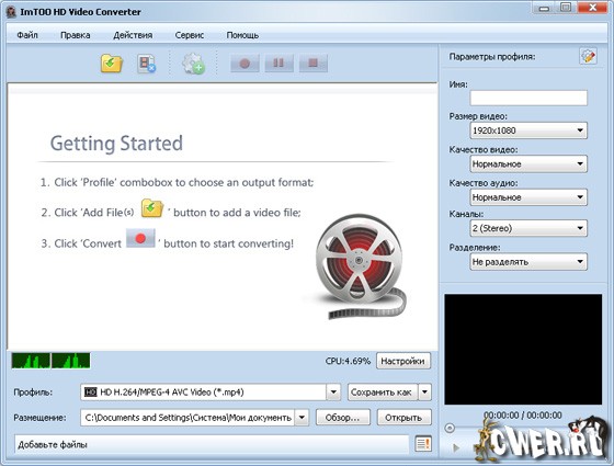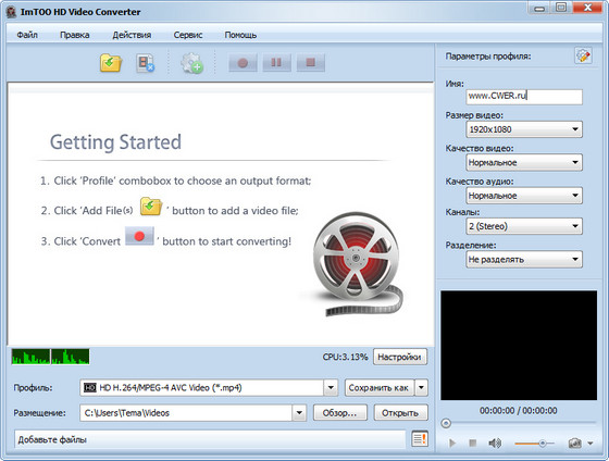 ImTOO HD Video Converter - конвертер видео файлов различных форматов в HDTV видео, поддержка TS, WMV HD, AVI, TS HD, WMV HD, TS HD и других видео форматов, поддержка High-Definition (HD) видео кодирования и декодирования, поддержка APE/CUE High-Definition, граббер аудио CD в поддерживаемые форматы, пакетный режим конвертирования, предварительный просмотр результата в встроенном проигрывателе.