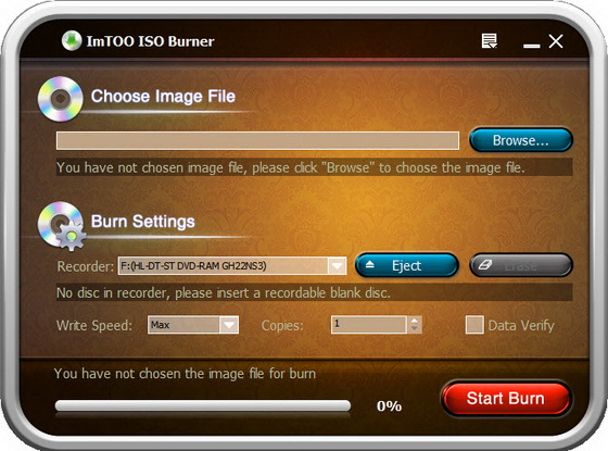 ImTOO ISO Burner - утилита для записи образов в формате ISO на различные типы носителей: CD-R, CD-RW, DVD-R, DVD+R, DVD-RW, DVD+RW и DVD+R DL. Поддерживается запись дисков CD и DVD с данными (в том числе создание загрузочных дисков), а также мультимедийных дисков. Программа позволяет установить скорость записи, по окончании процесса программа осуществит проверку записанных данных, что гарантирует работоспособность полученного диска в дальнейшем. Помимо ISO, программа поддерживает запись образов в форматах BIN/CUE, IMG, MDF, NRG, CDI, B5i, B6i и DMG.