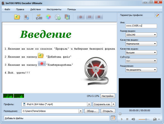 ImTOO MPEG Encoder - мощная утилита для конвертирования видео-файлов. Программа позволяет конвертировать файлы любых форматов, таких как AVI, MPEG, DivX, WMV, MP4, MOV, FLV, 3GP, PSP MPEG-4, iPod MPEG-4 и другие. Помимо этого программа может извлекать аудиодорожку из видео-файлов, конвертировать большинство популярных звуковых форматов, таких как MP3, WMA, WAV, AAC, M4A и другие. С помощью программы можно быстро и с высоким качеством конвертировать любой файл в мобильные форматы 3GP, FLV, PSP, Zune, iPod, iPhone, Apple TV для дальнейшего использования в портативных устройствах.