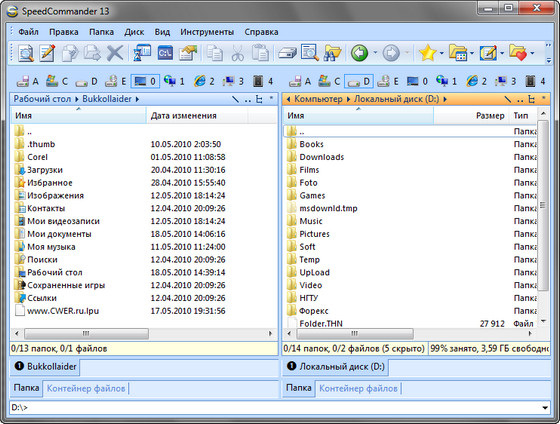 SpeedCommander - файловый менеджер с многочисленными, в том числе и уникальными, возможностями по работе с файлами. Из не совсем обычных функций имеет смысл обратить внимание на мощную систему шифрования файлов (файлы сжимаются - внутренняя поддержка ARJ, ZIP, LHA, RAR, CAB, ACE, GZIP, TAR и UUE, затем шифруются по стойкому алгоритму DES, а потом ещё и их названия можно защитить паролем). Кроме этой довольно редко встречаемой опции, в SpeedCommander имеется встроенная поддержка просмотра около восьми десятков графических и текстовых форматов; есть полнофункциональный текстовый редактор с подсветкой синтаксиса и не менее полнофункциональный FTP-клиент.