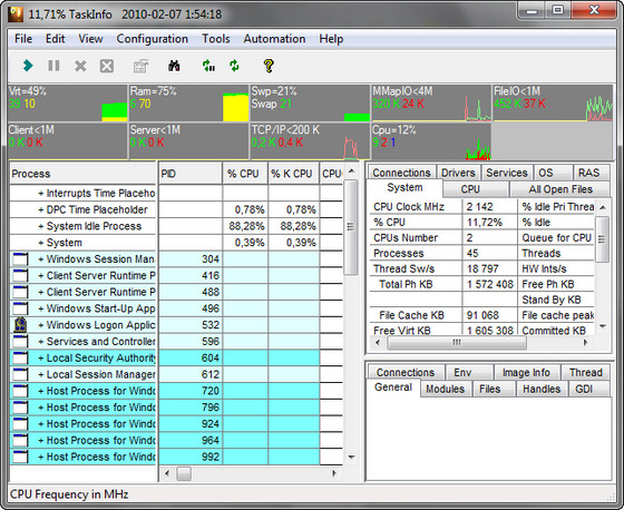 TaskInfo – мощное системное средство, сочетающее в себе функции менеджера процессов и программы для отображения системной информации. Выводит сведения о процессах и их нитях, которые выполняются на данном компьютере в режиме реального времени, подсчитывает процессорное временя, которое они занимают (в процентах и минутах), отображает тип процесса, его модули, переменные, память и другую полезную информацию. Позволяет управлять все теми же процессами, например, принудительно завершать или менять их приоритет.