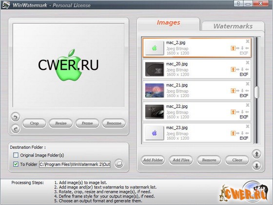 WinWatermark - программа для создания профессиональных водяных знаков. Программа позволяет добавлять текстовые и графические водяные знаки на любой фотографии, тем самым защищая ее от несанкционированного распространения. WinWatermark может не только создавать водяной знак, но и может помочь вам в обработке изображений. Вы можете персонализировать свои фотографии, используя привлекательные кадры. Программа может изменять размер изображения с высоким качеством, вращать и переименовывать фотографии, и конвертировать ваши изображения в другой формат, чтобы сохранить на диске. Поддерживается пакетная обработка файлов. Все это вы сможете делать за несколько секунд, и лишь одним нажатием кнопки!