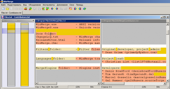 WinMerge - программа для визуального сравнения текстовых документов в Windows на предмет изменений в них. WinMerge умеет работать с DOS, UNIX и MAC форматами файлов, поддерживает Unicode и имеет подсветку синтаксиса. Может оказаться очень полезной, например, для определения того, что изменилось в одной версии проекта по сравнению с другой, а также для слияния изменений, выполненных в различных версиях. Кроме того, есть специальная панель для навигации по документу, при помощи которой можно быстро перемещаться к тем фрагментам файла, где есть отличия. Сравнение файлов можно выполнять с учетом регулярных выражений.