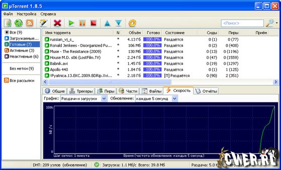 µTorrent - компактный BitTorrent-клиент с поддержкой одновременной загрузки сразу нескольких файлов, настраиваемой полосой пропускания, быстрым восстановлением прерванной загрузки и небольшим использованием памяти.