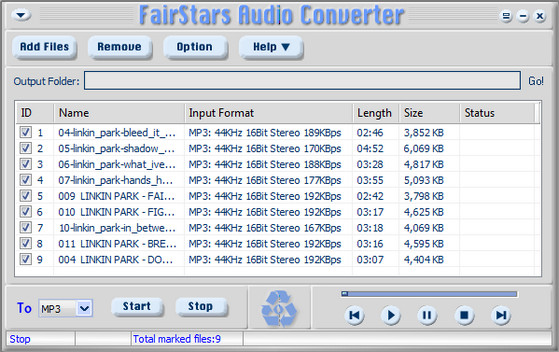 FairStars Audio Converter Pro - профессиональный инструмент для конвертации аудио файлов самых разнообразных форматов (WAV, RealMedia (RM, RA, RMVB, RMJ), AIFF, AU, Creative VOC, PVF, PAF, Amiga IFF/SVX, APE, FLAC, OGG, VQF, MP1, MP2, MP3, WMA, WMV, ASF, MP4, M4A, M4B, AAC to WMA, MP3, AAC, VQF, OGG, FLAC, APE, WAV). Кроме этого утилита позволяет нормализовать композиции по звучанию, улучшить качество воспроизведения, имеет встроенный плеер и позволяет редактировать ID3 теги.