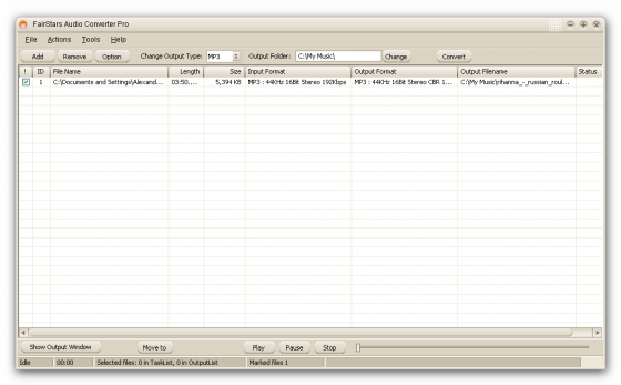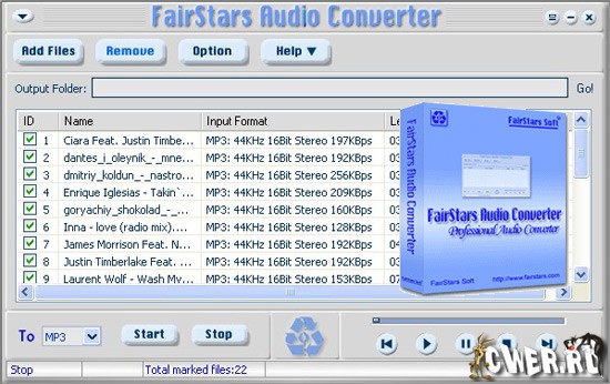 FairStars Audio Converter - является профессиональным инструментом для конвертации аудио файлов самых разнообразных форматов (WAV, APE, OGG, MP1, MP2, MP3, WMA, WMV, ASF в WMA, MP3, OGG, APE, WAV). Кроме конвертации утилита позволяет нормализовать композиции по звучанию, улучшить качество воспроизведения, имеет встроенный плеер и позволяет редактировать ID3 теги.