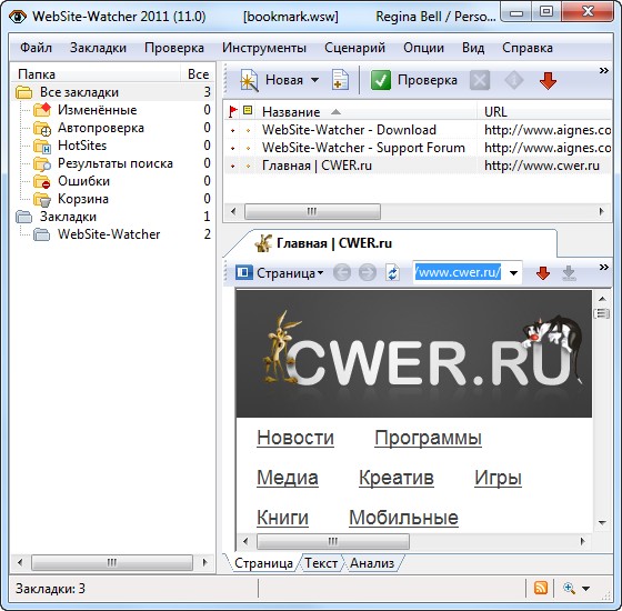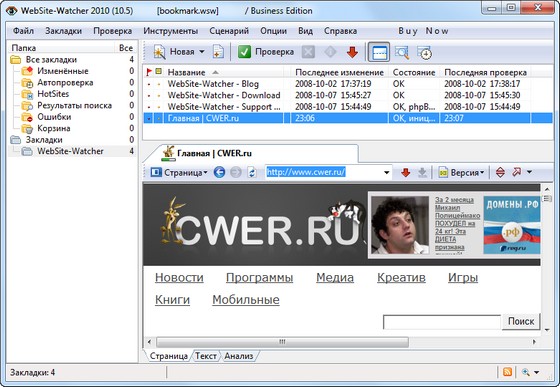 WebSite-Watcher — мощное приложение для отслеживания обновлений на сайтах, проверяет неограниченное количество сайтов на предмет изменения и дополнения. При обнаружении изменений, он сохраняет последнюю версию на диск и выделит цветом все изменения в тексте. Использование WebSite-Watcher сэкономит не только Ваши нервы, но и время, а как следствие — деньги, поскольку время, проведенное в Сети, заметно сократится. Кстати, с помощью этого прекрасного помощника Вы сможете также быстро отослать электронную почту. Поддерживает интеграцию с IE, Netscape и Opera.
