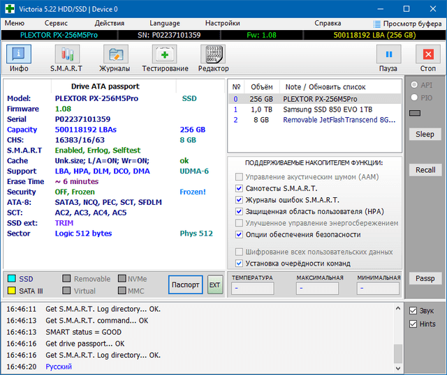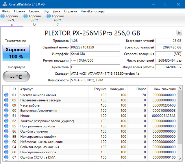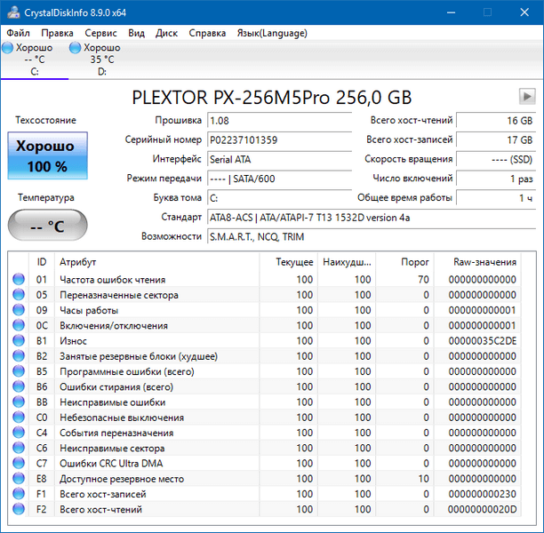 CrystalDiskInfo – следит за «здоровьем» жестких дисков, поддерживающих технологию самодиагностики S.M.A.R.T. Осуществляет мониторинг и дает общую оценку состояния вашего диска. Также выдаёт подробную информацию о жестких дисках, установленных в компьютере (прошивка, серийный номер, стандарт, интерфейс, общее время работы и др.) и выводит параметры атрибутов S.M.A.R.T. (ошибки чтения, производительность, запуски/остановки шпинделя, время поиска дорожки, количество циклов включения-выключения, ошибки секторов и многое другое). Может выводить в трее индикаторы с температурой каждого накопителя, строит график изменения температур. Позволяет управлять настройками производительность/шум.