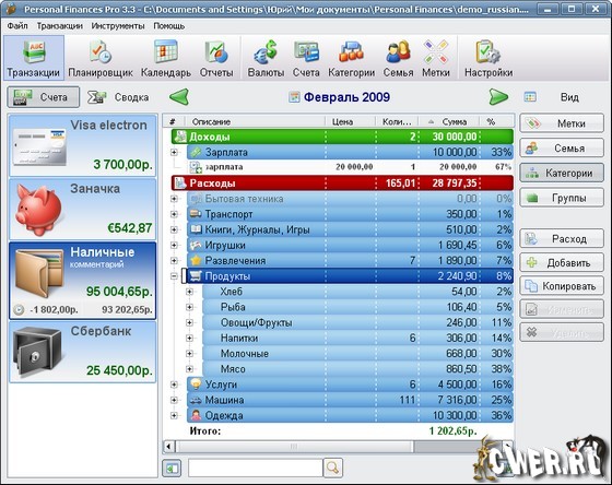 Personal Finances Pro - профессиональная версия программы, предназначенной для управления личными расходами и доходами. Данная программа поможет вам контролировать свои финансы – понять, куда уходят деньги, выделить излишне "разбухшие" статьи расходов и заметно сократить ненужные траты. Отличительными особенностями программы являются красивый и продуманный интерфейс, простота использования и наглядность результатов. В основе программы лежит идея разделения расходов и доходов на категории, что позволяет сразу, без необходимости изучать отчеты, видеть, куда и в каких количествах тратятся деньги. Расходы и доходы так же можно делить по членам семьи и присваивать им специальные метки. Таким образом, можно легко оценить все движения денежных средств - от общей картины до мельчайших деталей. Интерфейс программы переведен на несколько языков, включая русский язык