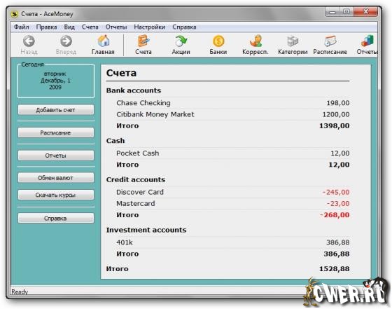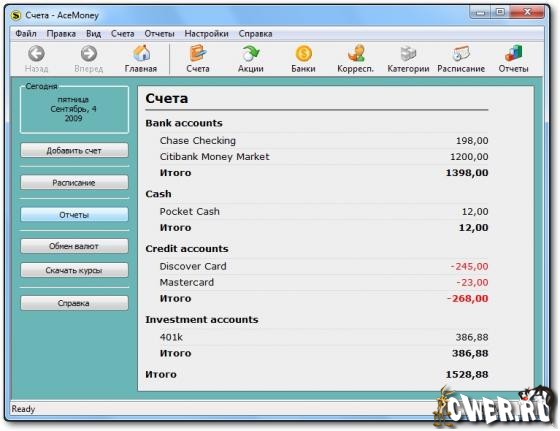 AceMoney помогает просто и эффективно управлять расходом личных денежных средств. Мы разрабатывали AceMoney для тех, кто не имеет ни малейшего понятия о бухгалтерии. Несмотря на свою простоту, программа обладает всеми качествами больших финансовых пакетов. Ваши расходы и доходы учитываются в нескольких валютах. Программа поддерживает более 150 валют и автоматически скачивает их курсы обмена из интернета. AceMoney позволяет с легкостью следить за текущим состоянием ваших акций и фондов. К тому же, программа позволяет скачивать текущую стоимость акций с российских и международных бирж.