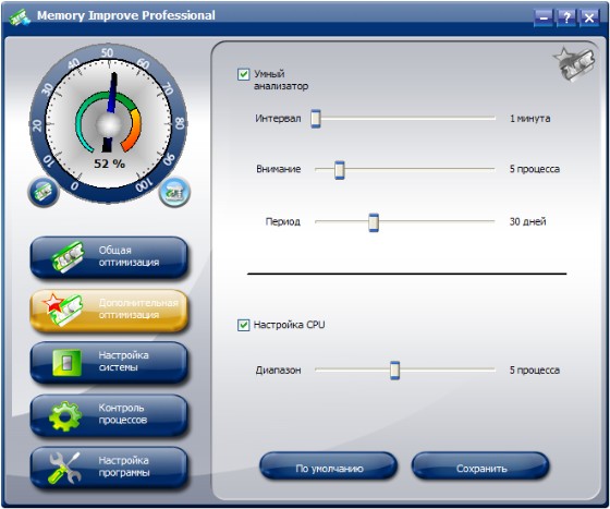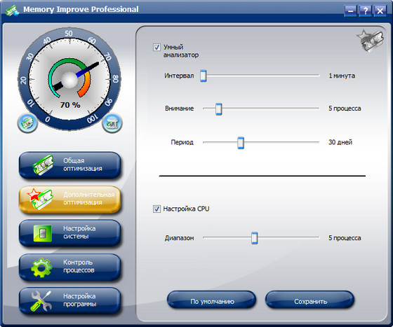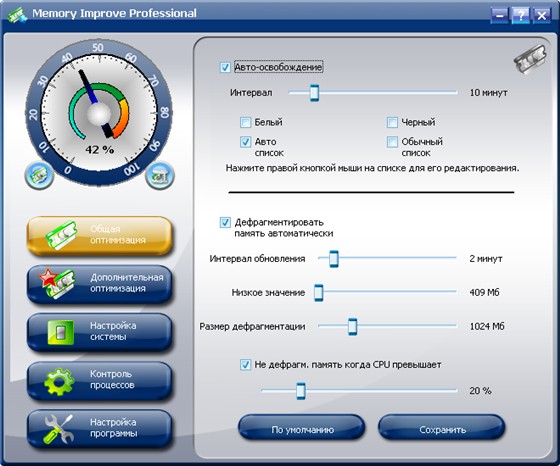 Memory Improve Professional – это один из полезных инструментов, который в информативной форме в виде прибора показывает текущее состояние потребления памяти и может автоматически или вручную производить дефрагментацию и освобождать для вас ресурсы в виде дополнительной памяти. Это в целом улучшит работу системы, уменьшит время её загрузки и повысит её производительность.